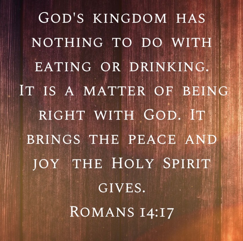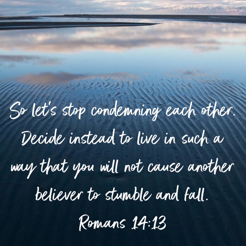 According to chapter 14 it is not our place to judge the beliefs of worship methods of our fellow believers in so far as what they are doing does not go against the absolutes of scripture and it is being done earnestly for the Lord. “Who are you to judge someone else’s servant?” “God has accepted him.” Our differences in denominational belief should not be something that separates us from one another. We must accept one another as family, be united in Christ against the powers of this world. We must each concern ourselves with what we believe, how we will worship, “Each one should be fully convinced in his own mind.” So decide, between you and the Lord what your personal convictions are. Be fully convinced of it and do your best to live it out. Realize that not everyone’s directives are exactly the same, God leads us individually in areas of our lives. Again, these convictions and beliefs should not go against the word of God. If they contradict then we need to reassess them. These individual leadings will sometimes mean that a fellow believer feels a conviction toward something that you may not. That is fine, God is speaking to each of us as individuals and so He may ask one person to stay away from certain things and not another. We must be careful that our freedom in Christ does not cause another to stumble and fall away from their relationship with God. Use good judgement in what you do, pay attention to who might be watching and understand the effect that each might have on the other. We must treat our brothers and sisters with love and consideration to help them move forward, not back.