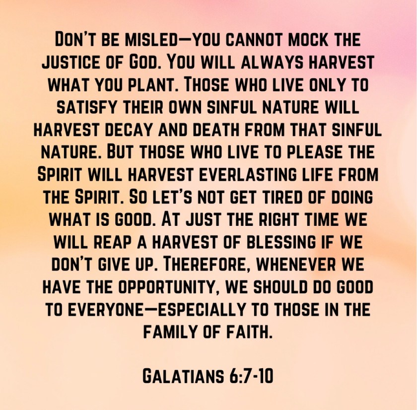 God cannot be duped, cheated or defied. We will reap whatever it is we have sowed. There will be no hiding from it, covering it up, talking our way out, or refusing the consequences. We must guard our hearts, check our actions and words against God’s word. Have care that the things you sow. Choose to sow things that please the spirit. Do good at every opportunity.