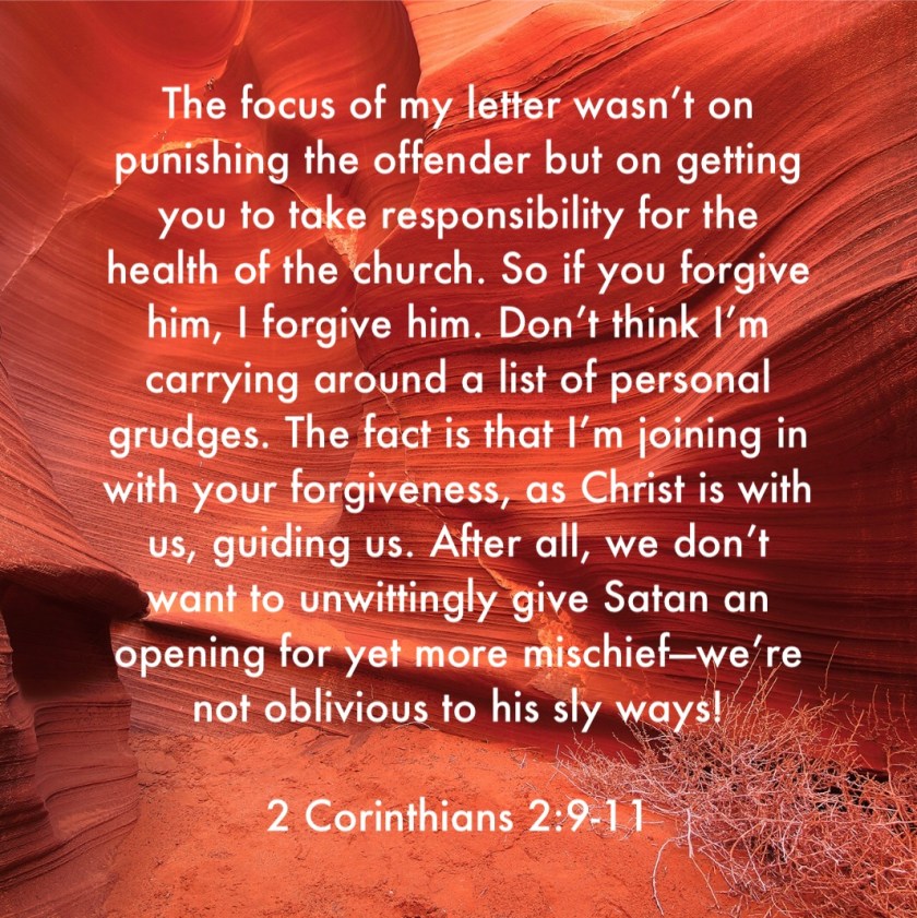 Satan’s sly ways appear to be closely linked with our personal grudges. Unforgiveness opens us up to his ‘mischief’ & schemes. Forgiveness releases us from a burden that we have placed upon ourselves when we are wronged by another. If we cling to that wrong, it will fester within us and leave us wide open for the enemy to plant seeds of resentment, ideas of vengeance, lies of justification. When we refuse to give our injury to God, the enemy is able to creep through the cracks in our godly armor that have been left there by a wounded pride or a wounded heart. Once he is in, he will begin his schemes of deception, the biggest one being that we have the right to be angry and therefore refuse to let go because they were the one in the wrong, that they now owe us something. Give that debt to God, rest in knowing that they will have to answer to Him and that it is His job to make things right. Trust Him, release that debt to Him, and be at peace.