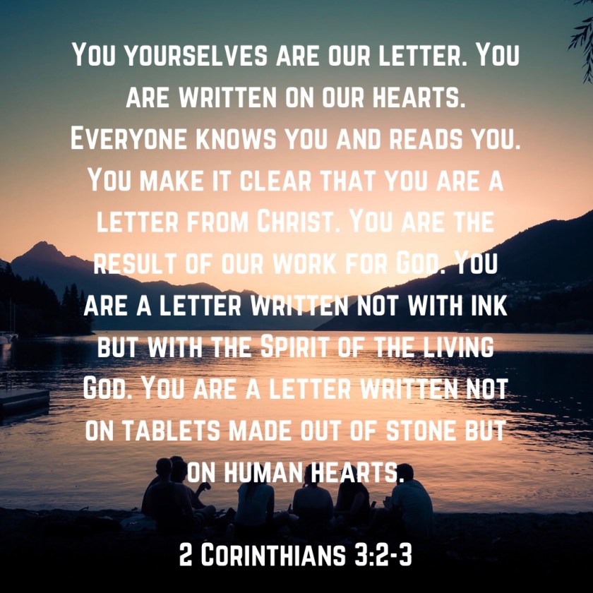 Our lives are a letter, written out as plain as day and open for all to read. The people we encounter every day can see through our pretenses and catch glimpses of what message is really written on our hearts. So what is our letter saying to them? Is it calling to them from Christ, showing them His love and pointing the way toward the peace and salvation He offers? Are they seeing the ink bleed through to the surface from having the Spirit of God inked so heavily onto our hearts? Or are they reading a different message? One that says we are no different from everyone else, no less petty, no more patient, no more kind, no less jealous or angry? Would we be embarrassed for the letter of our hearts to be opened up and displayed before our friends, family, & community if it were actual ink and paper? Because we can be assured that it is no less concealed within us. What is bleeding through into our lives, the ink of the Spirit or the ink of self?