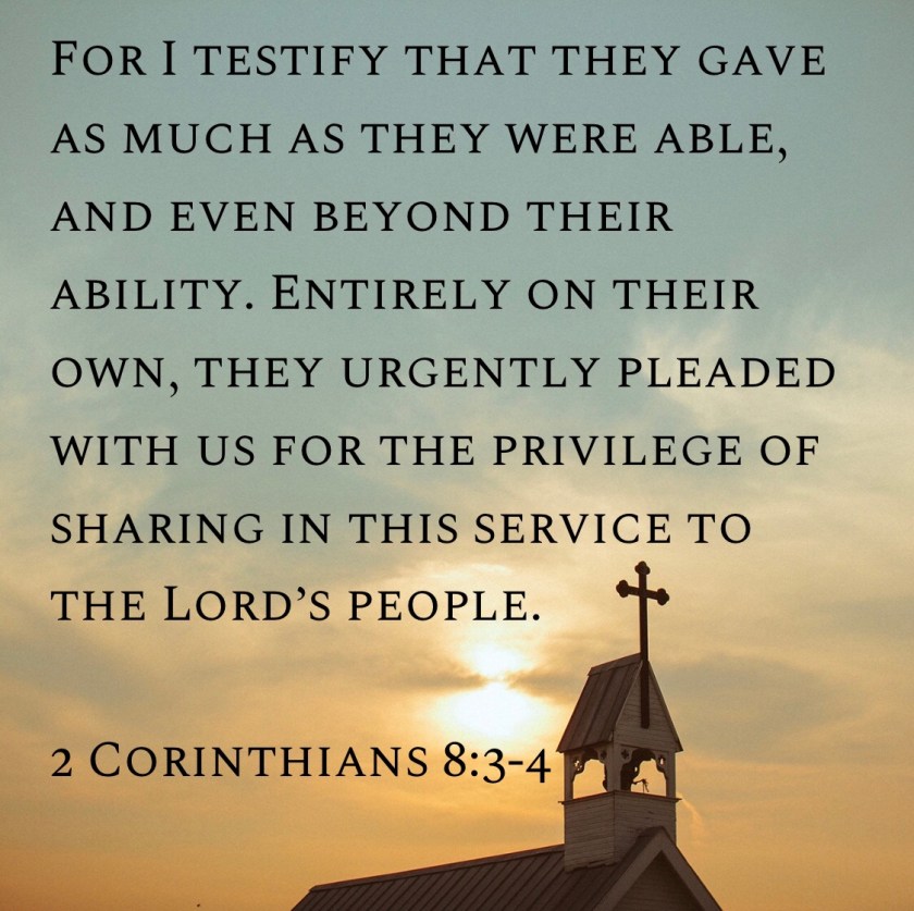 How do we view tithes and offerings? As something to avoid? As something to grudgingly give because it is asked of us? These believers in Corinth begged for the privilege of giving, even when they had little. Why? Because their hearts were full of God. They knew that everything they had belonged to Him and their hearts overflowed with compassion, their eyes were focused on others rather than on themselves. God’s Love flowed through them giving them a genuine desire to help. Do we see our offerings doing that, helping the saints, or just something we do because God asks it of us? We have been given the privilege of helping in God’s work by helping those doing His work. Set your heart on others, not self, and find the joy of serving through giving.